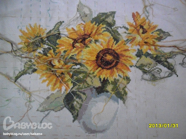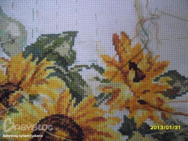 Девушки привет! это мои любимые подсолнухи, ещё чуть-чуть и они готовы, но возник такой вопрос? В какую сторону выполнить полукрест - в сторону основного креста или в противоположную сторону? полукрест идёт как с середине рисунка, так и выступает тенью рисунка. На фото 2 полукрест я выполнила в середине рисунка в сторону основного креста.
