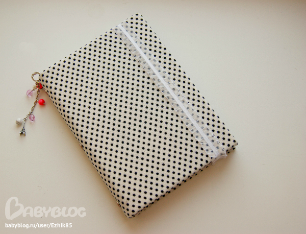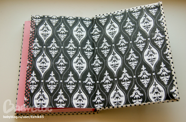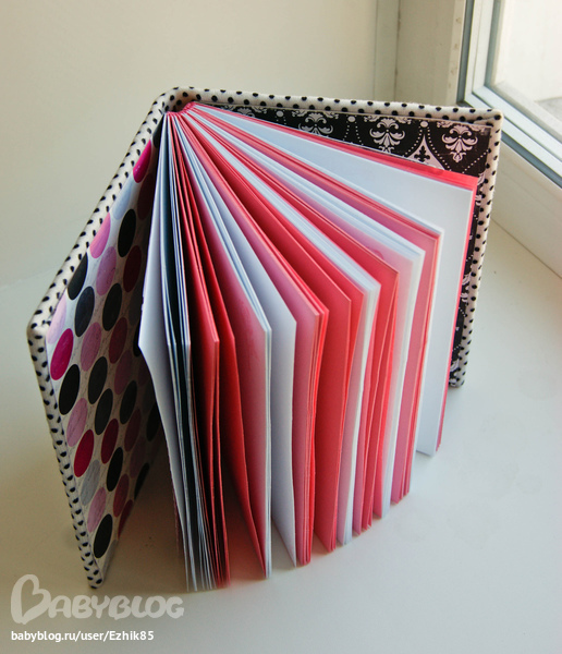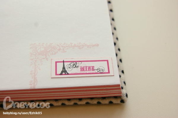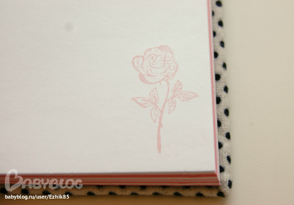 120 бело-розовых листов офисной бумаги,украшенных штампами.Обложка чипборд+фетр+ трикотаж в горошек, украшена брадсами.Закрывается на кружевную эластичную тесьму. В дополнение к блокноту идет закладка, металлическая со стеклянными бусиными и жемчугом сваровски.