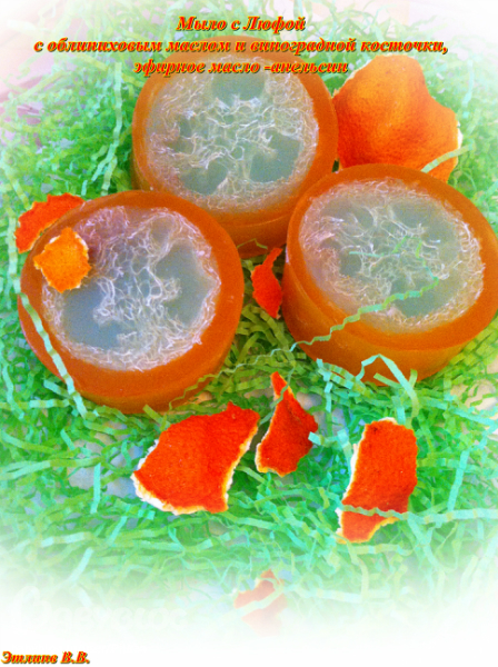 Это красивое мыло с люфой обладает выраженными антицеллюлитными и отшелушивающимисвойствами: люфа дает хороший массажный эффект, а цитрусовые эфирные масла, входящие в его состав усиливают кровообращение и выводят шлаки и токсины из подкожно-жировой клетчатки