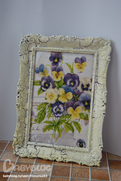 Материалы и краткий ход работы: приклеила салфетку на пва к канве,высушила, проколола дырочки, старую бабушкину рамку загрунтовала 2 раза, прокрасила фиолетовым акрилом, нанесла кракелюр, мин 15 подождала, потом сверху прочпокала светлым акрилом с помощью губочки, к картону приклеила канву и вставила в рамочку:)