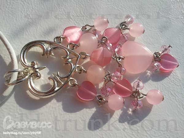 Выполнен из розового кварца, стекла (чешское гранёное и имитация кошачьего глаза) и металла, швензы - мельхиор.