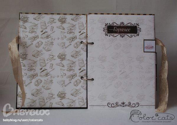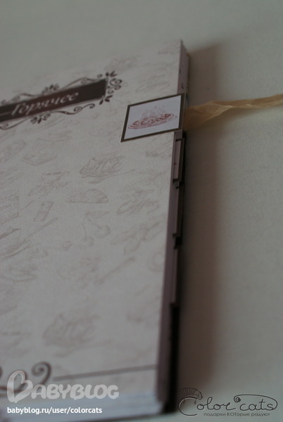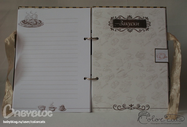 http://www.babyblog.ru/user/lenta/Niseko. Хлопковая обложка, формат А5, внутри четыре разделителя: "Закуски", "Горячее", "Десерт" и "Разное", а также таблица мер и весов.