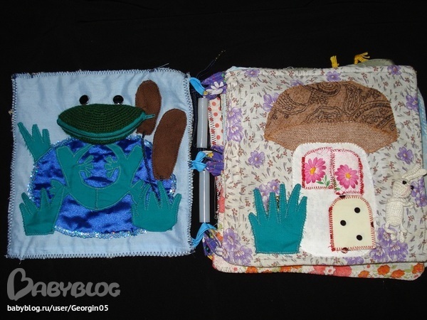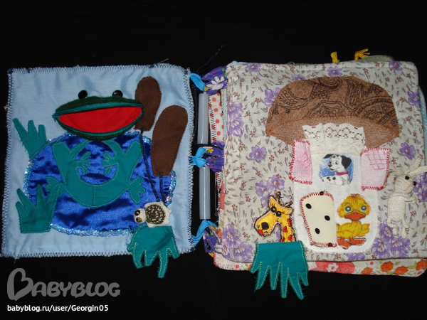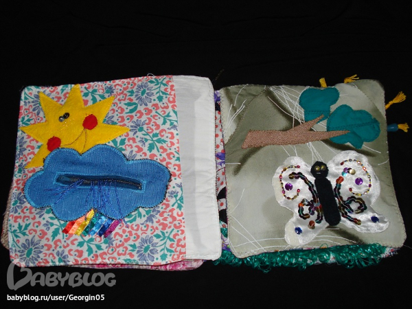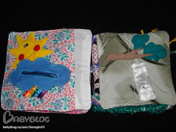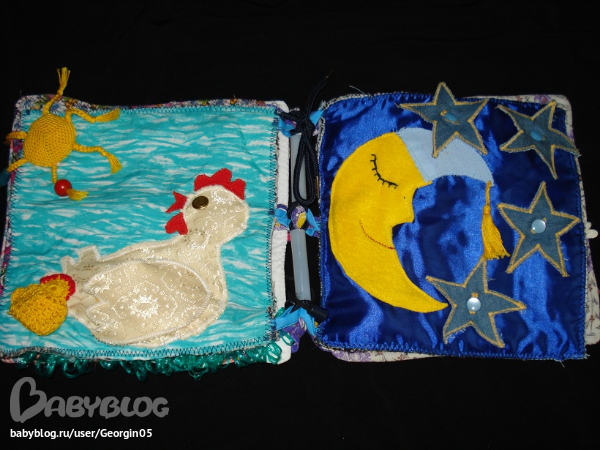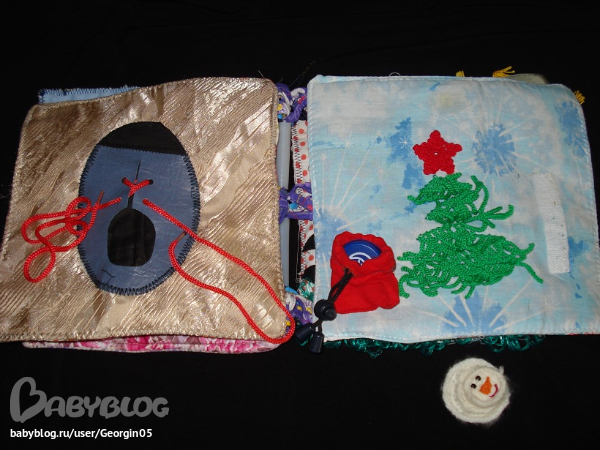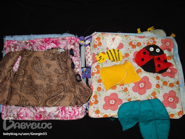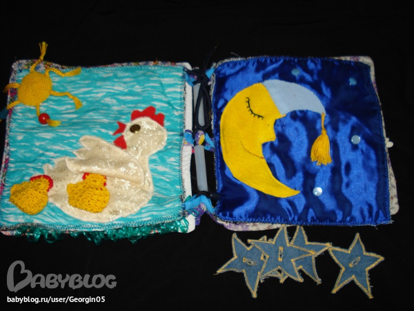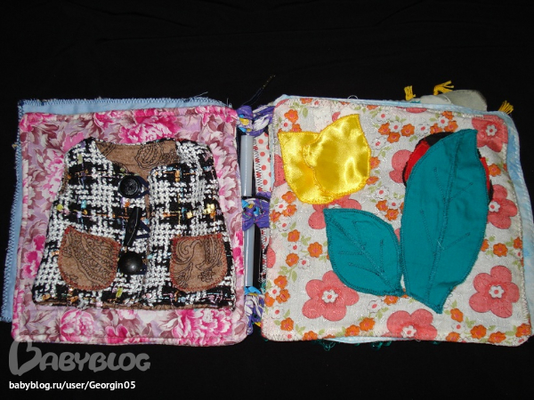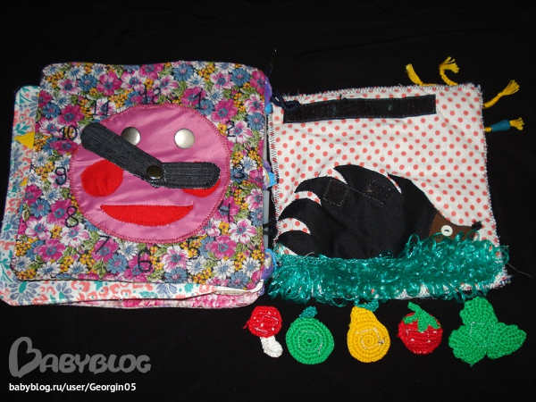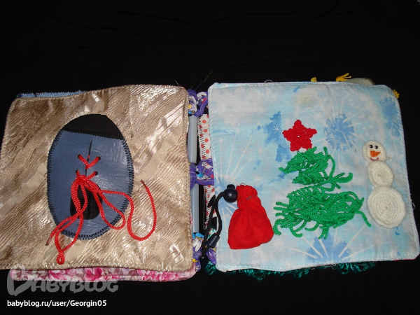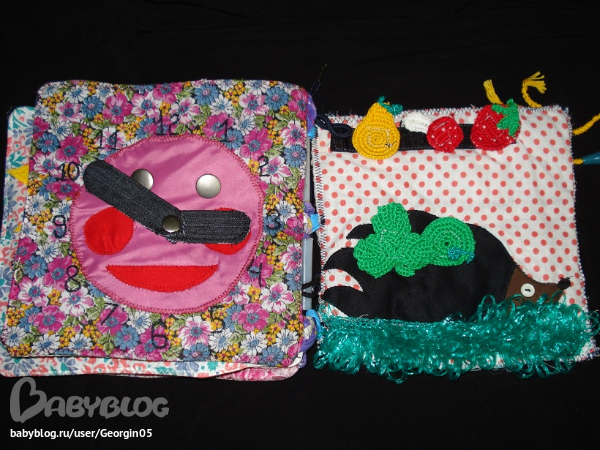 Вот такая развивающая книжечка сшилась сыночку. Шила её очень долго- пока готовила-искала лоскутки, заготовки вывязывала... Она у нас без обложки:))))