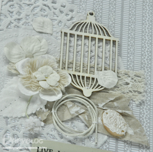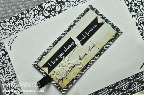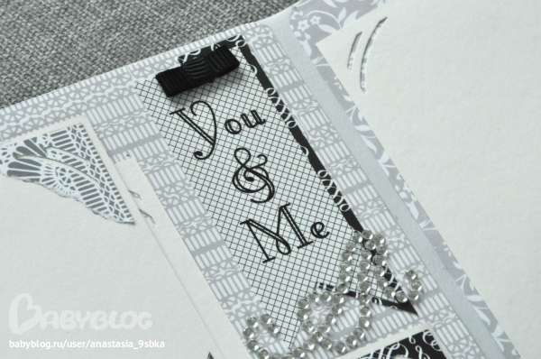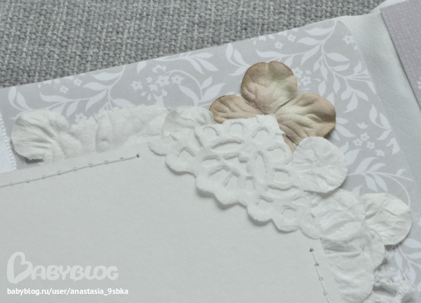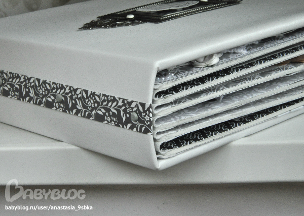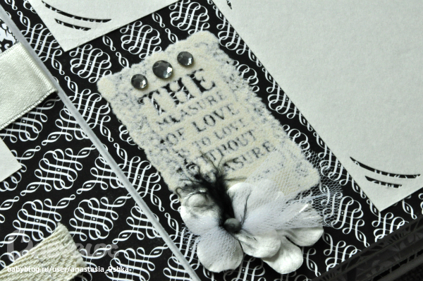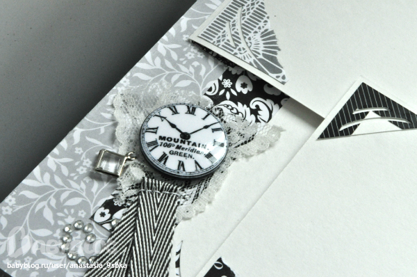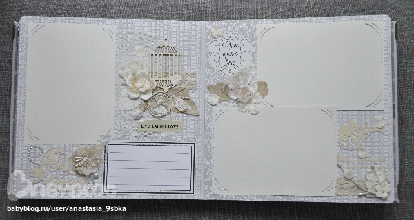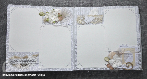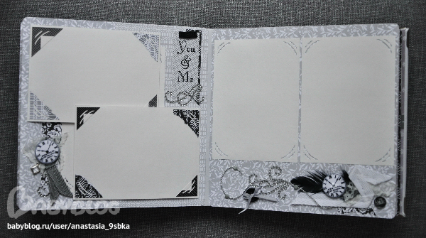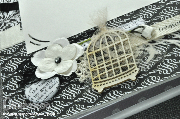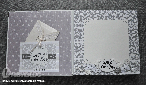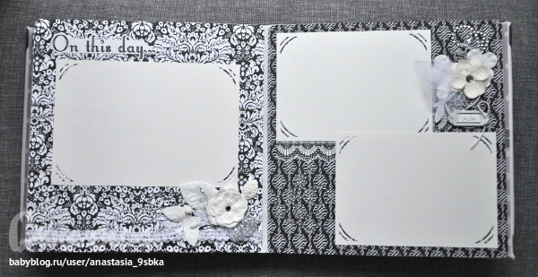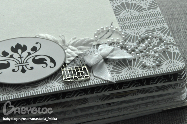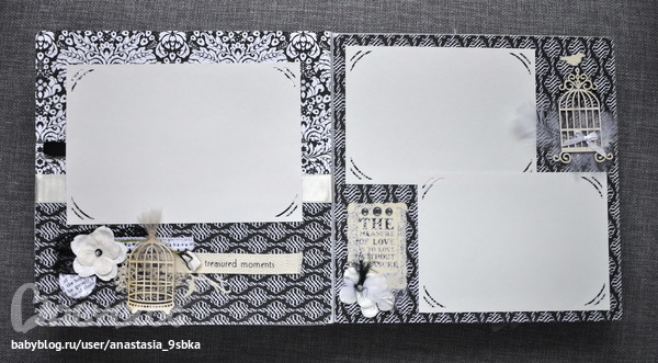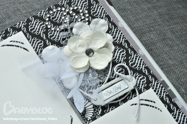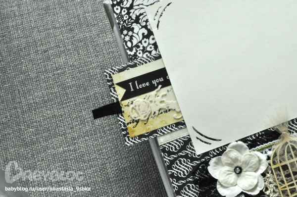 Это альбом классической свадьбы - черное и белое, жених и невеста, прошлое и будущее. Мне очень хотелось не только использовать прекрасную бумагу Echo Park, на которую я не могла налюбоваться, но и сочетать в альбоме два начала - жених - черный фрак, бриллиантовые запонки, шелковый платок в нагрудном кармане и нежная невеста - вся в облаке фатина, с ниткой жемчуга на груди, высоко взбитыми локонами и букетом флер'д'оранжа. Альбом наполнен белыми лепестками, которыми молодеженом осыпают на пороге церкви)... Вот такие образы пришли мне в голову..)