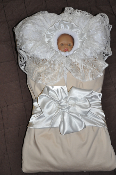 Немножко по другому запаковала, скажем так. Уголок- пеленку углубила немного и получилось, что гипюр вроде бы покороче и поаккуратнее смотрится. По поводу собачки на молнии, я конечно с Вами согласна, смотрела сегодня другие собачки со стразиками, но все они металические и на фоне конверта смотрится как-то "не из этой оперы". Честно. Хотя для меня не проблема заменить собачку. ПРосто решила немного ее прикрыть. Фактически так и будет - не оставят же ребенка с голой шейкой))) НУ и ленточку попробовала перевязать по другому. А так как Вам?