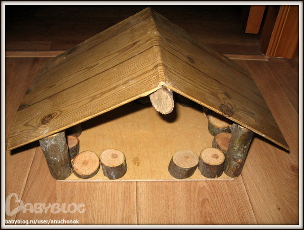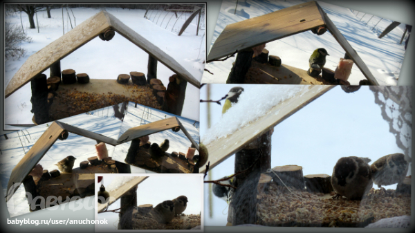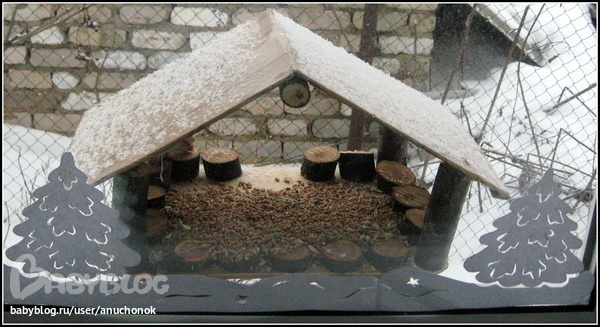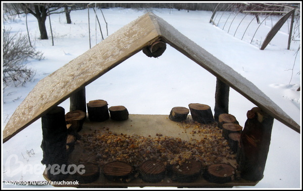 Работа с деревомУже третий месяц мы с дочкой радостно наблюдаем, как в наш домик слетаются птички..Материал использовали большей частью природный.
