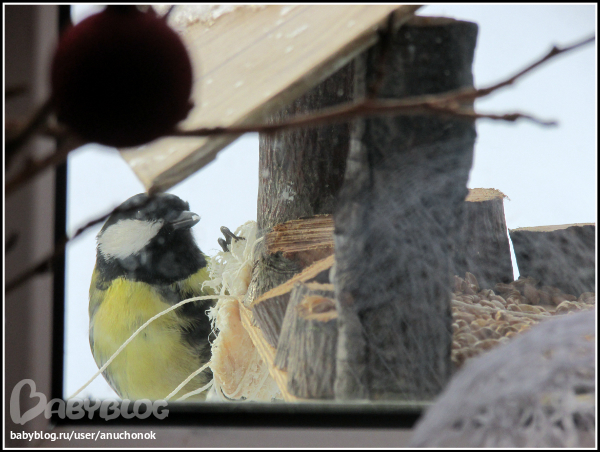 Можно рассмотреть поближе - синичке тоже интересно, кто в домике живет?