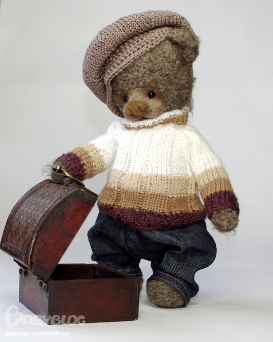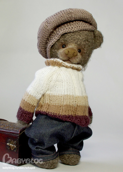 Авторский мишка тедди. Связан крючком, мордочка- сухое валяние, стеклянные глазки, вязаный свитерок и головной убор, джинсы. 6 шплинтов. Рост 25 см
