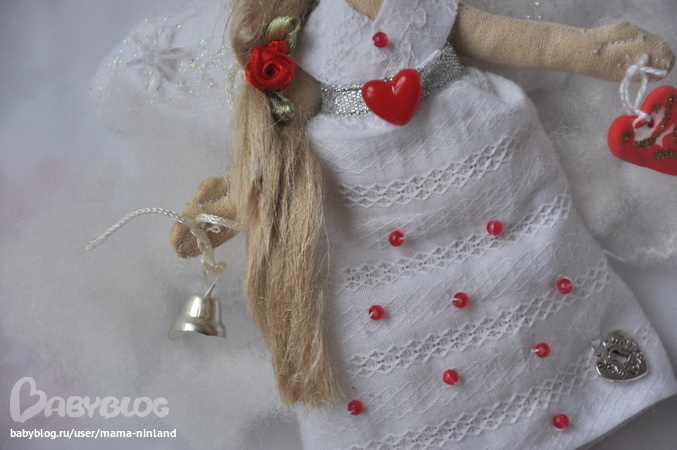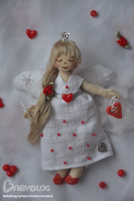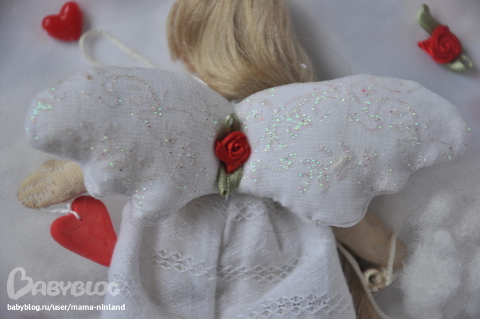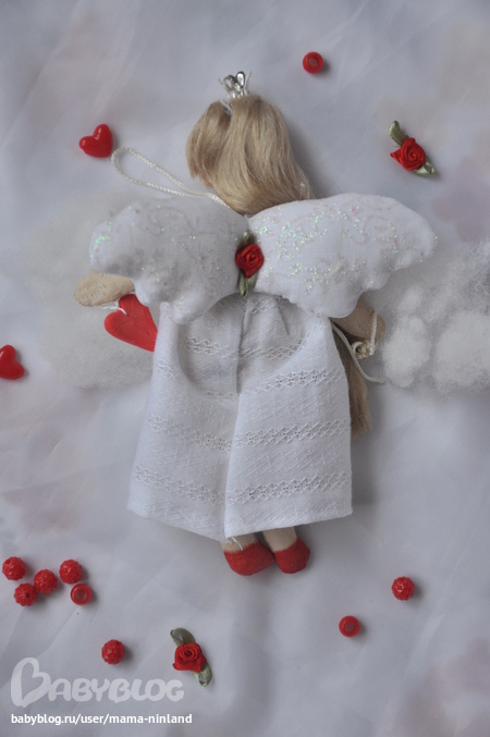 Агел Любви держит в руках звенящий (на самом деле звенит)) колокольчик, сердечко (дочка помогала лепить и красить из спец затвердевающей массы).
