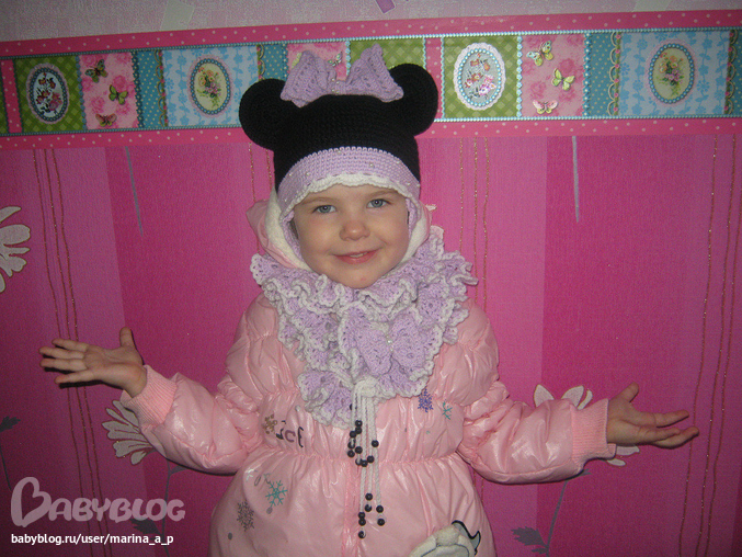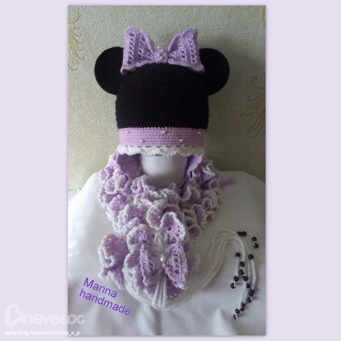 Здравствуйте, девочки! Заказали мне шапочку мышки Микки Мауса от мастерицы Тим, да ещё и в таком же цвете. Цвет, на мой взгляд, я смогла подобрать и надеюсь у меня получилось воссоздать то, что на картинке, и ещё я связала к ней шарфик.