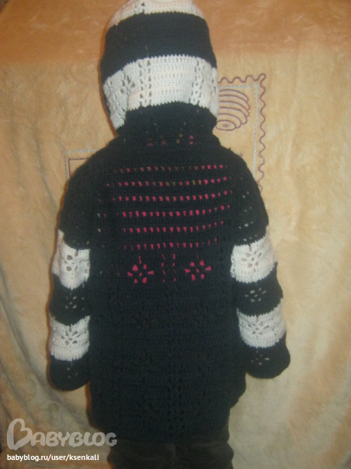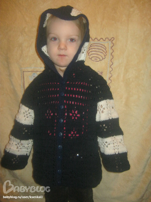 а сарафанчик на вырост получился? Кофточка хороша, правда на мой взгляд слишком много чёрного цвета, вот бы полосочек белого ещё спереди добавить....и зёбра была бы, но это чисто ИМХО!!! А так всё очень хорошо, ровных вам петелек!!!!!!!