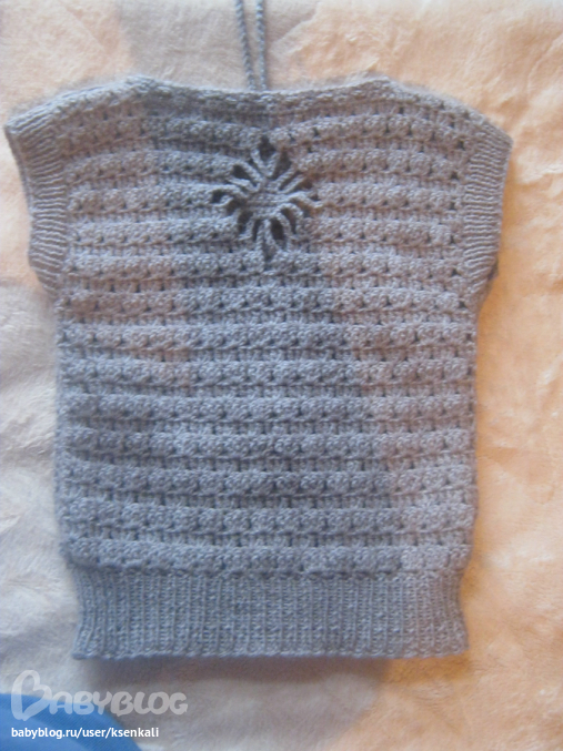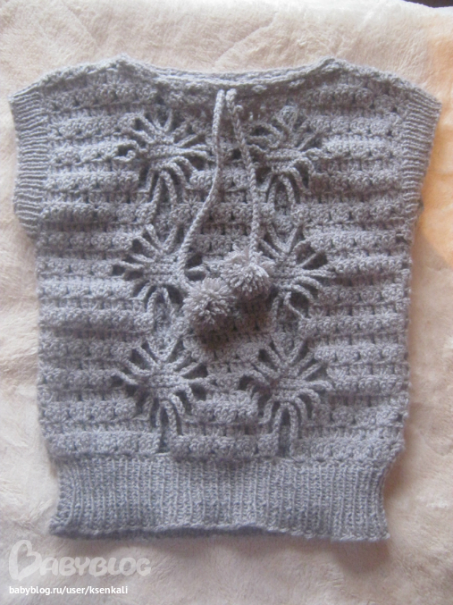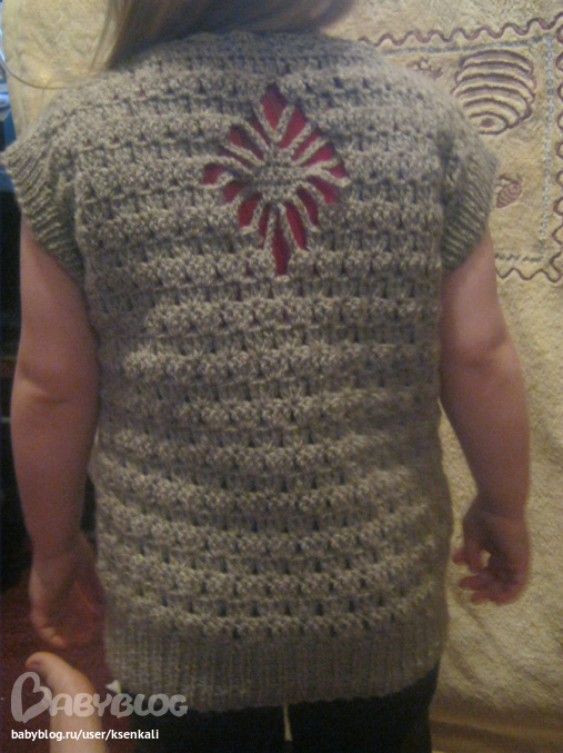 я уже вязала такую жилетку,но ими похвастать не могу так как одна у племяницы а вторая у племянницы моей подружки(живет в другом городе). Эту связала младшей доченьке