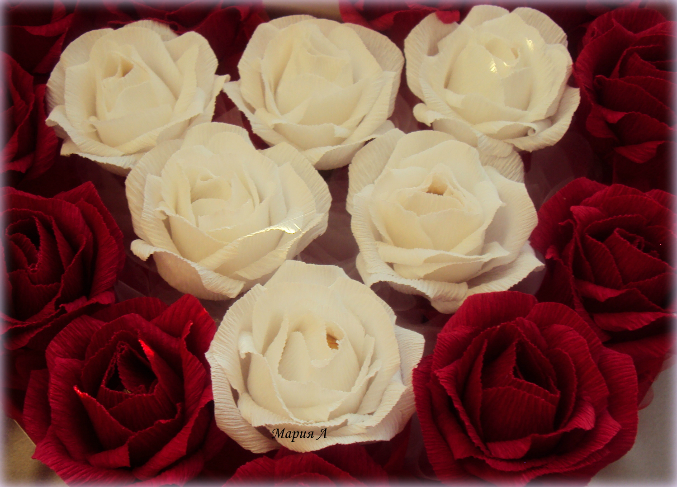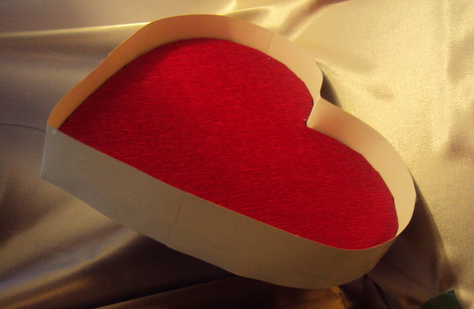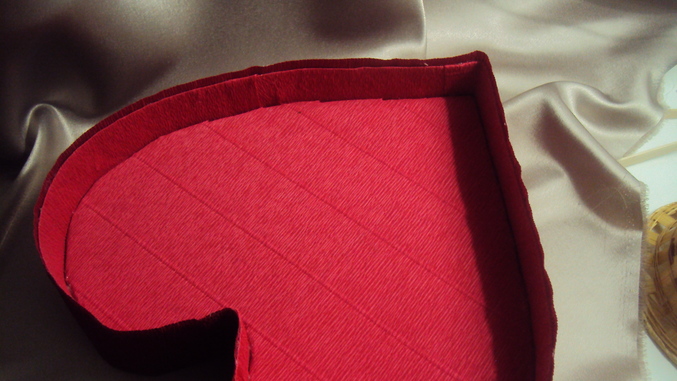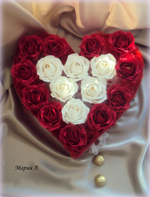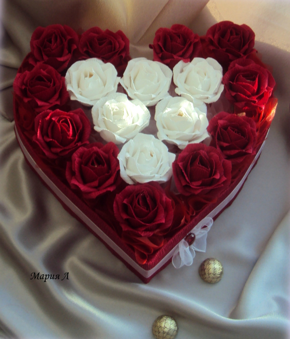 спасибки ,Марина! форму сердца вырезала из пенопласта или пеноплекса (так и не знаю как правильно этот материал называется), обтянула гофрой внутри и снаружи, но сначалая сделала розочки ..приерн ихразложила итолько потом сердце вырезала, чтоб с размером не промахнутся