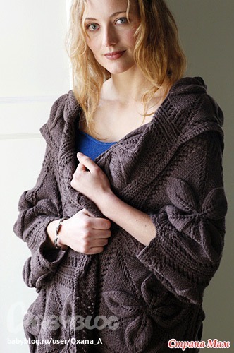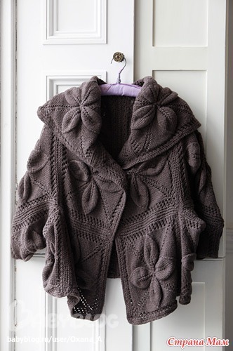 Похоже что он сшивается из 2-х прямоугольников по рукаву и остается дырка,для руки.У меня знакомая вязала кардиган,только длинный,сшивала потом таким образом.
