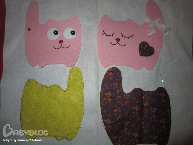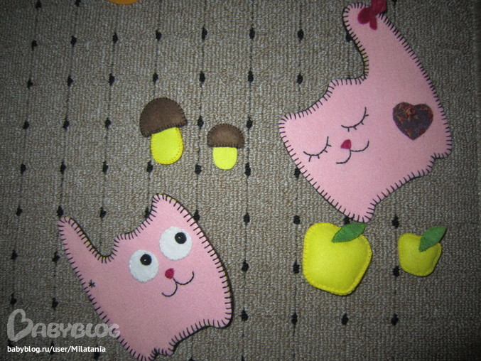 Для работы использовала полужесткий фетр 1.2 мм и х/б с цветочками+липучки.Всё художество висит теперь на ковролинографе.