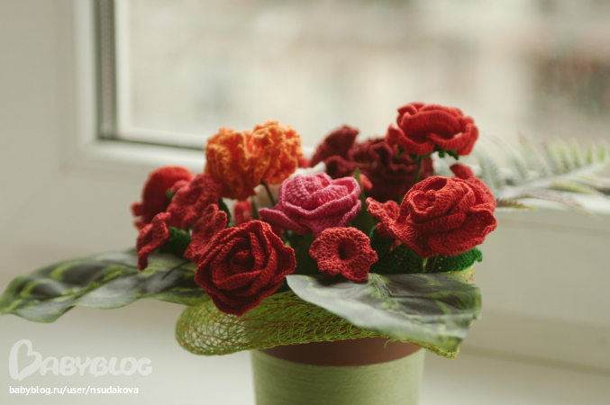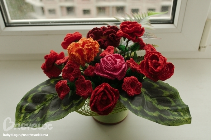 Цветочную композицию сделала для Тани в подарок: розы, гвоздики и много мелких цветочков. Горшочек обычный, цветочный. Обмотала его светло-зеленой нитью (хлопок).