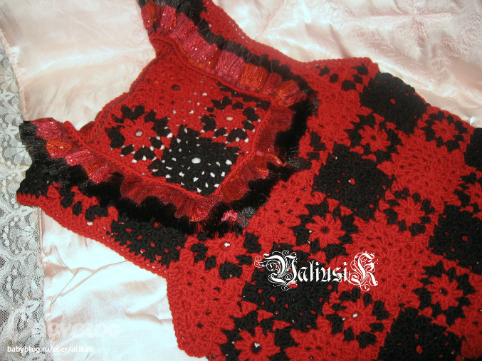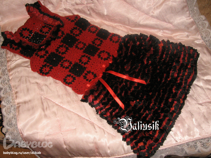 Давно хотела попробовать ленточную пряжу болеро от ЯрнАрт. И вот в школу крестнице придумалось такое платье. Почему черно-красное? У них дресс-код в лицее красно-черная клетка. Вышло немного торжественно, но девченки так это любят. вообщем платье пришлось по вкусу, я угодила и по размеру, чем уже я несказанно довольна. На модели фото нет. Так что пока только так