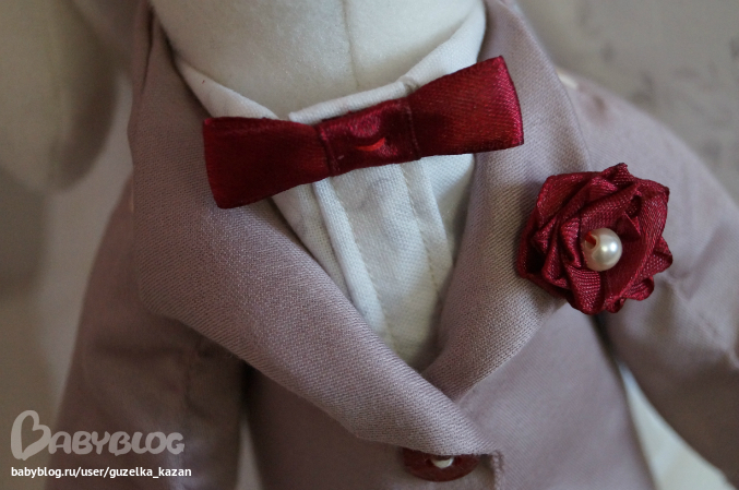 Очередная свадебная пара сшита на заказ. Пожеланием заказчицы было присутствие вишневого букета, гипюра и кружева у невесты. Свадебные зайки уже на днях попадут в руки к хозяевам и будут радовать их!!!Чему я очень рада!))