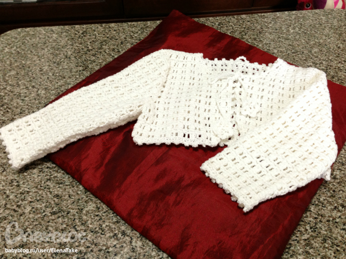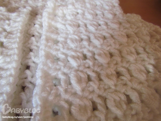 Я немного притормозила с болерошками, но покажу что уже навязалось. В белом варианте вяжу пышные столбики из видеоурока, осталось связать рукава. Схемку урезала, т.к. вяжу на полтора года, а пряжа очень объемная.