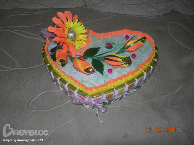 А мне нравиться сочетание желто- оранжевого, правда, его чаще используем для осенних букетов, но и здесь очень "солнечно" смотриться. Только бы еще ленточку поменять на желтую или оранжевую.