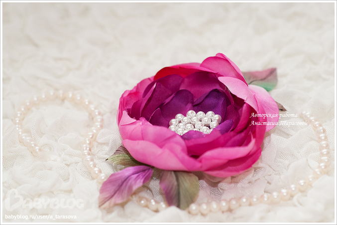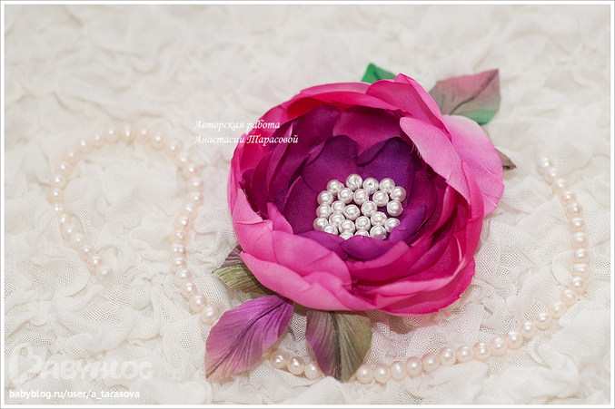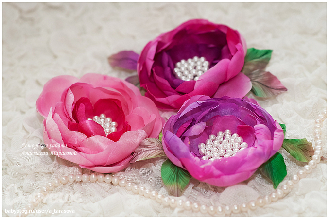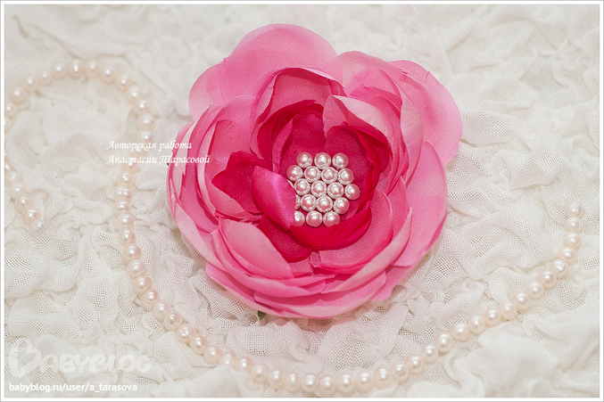 Все цветочки из натурального шелка - крепдешина и атласа,тонировала ткань сама. Серединка выполнена из жемжужных бусинок.
