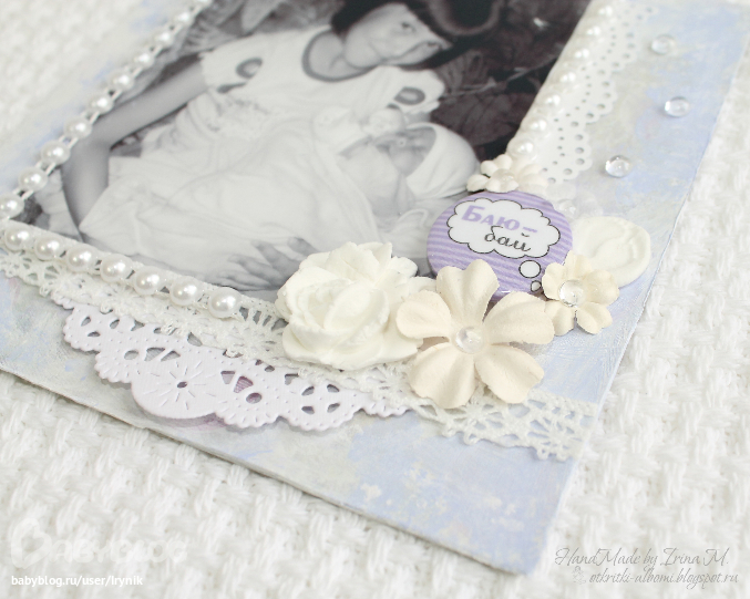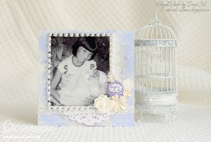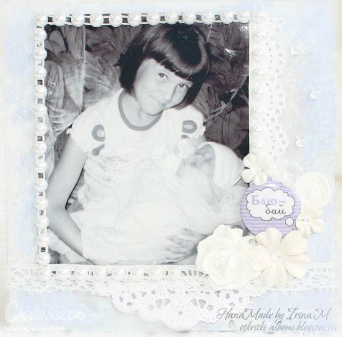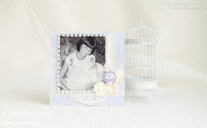 Мини-страничку (фоторамку) подарю маме на 8 марта. На фото её младшая доченька Полина (моя родная сестра), а на руках у Полины спит уже моя доченька Алина (тут ей нет и 2-х месяцев)-мамина внучка. Не запутала Вас?