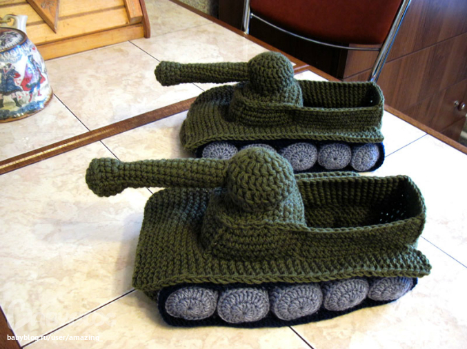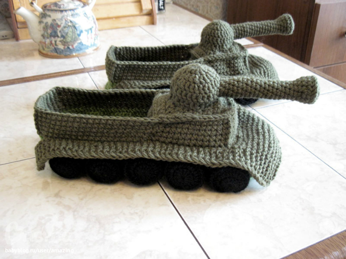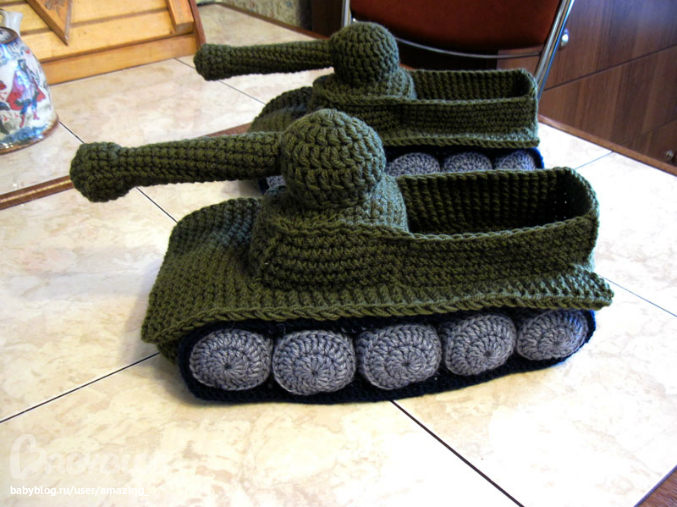 Связала колеса: 1 ряд: 10-13 стсн в кольцо, 2 ряд: прибавки - получилось 20-26 стсн, 3 ряд: изнан. рельефн столбики, 4 ряд: стсн. Далее пришила к стенкам танка набив синтепухом. Связала гусеницы: 126 стсн в два ряда. (можно спицами платочной вязкой - петли по ширине колеса), пришила.