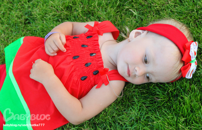 Очаровашка в арбузике! И сарафанчик и лента просто загляденье! Ткань и лента арбузная очень понравилась! Можно поинтересоваться, где ткань и ленточки покупали?