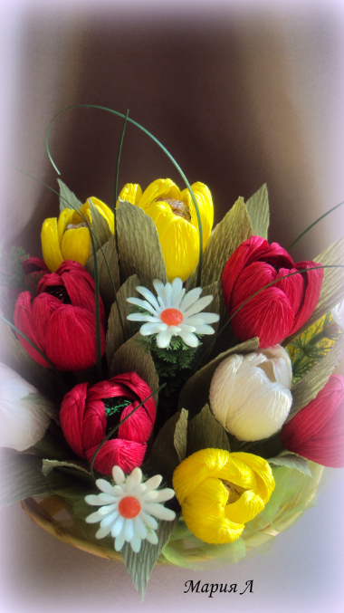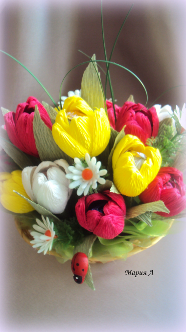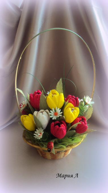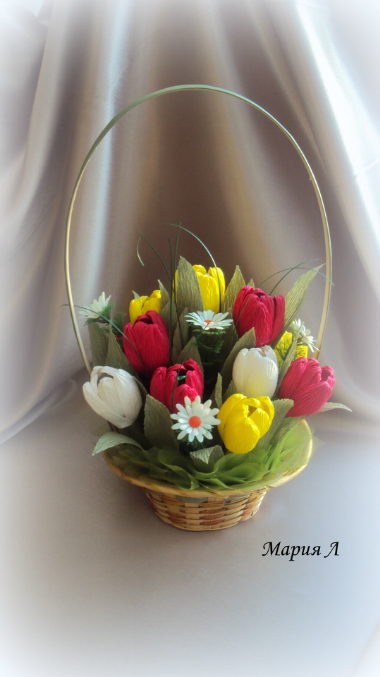Маша. чудесная корзиночка! Вот теперь я поняла разницу между крокусами и тюльпанами)))) А то не понимала. чем они отличаются))). Очень здорово, радостно, по весеннему и цвета - настоящие