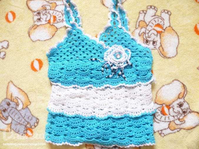 Этот топ собран из двух)) Я пользовалась материалами с Осинки, ссылку выложила в теме, посмотрите там "схема кокетки к красному топу". Там и описание есть. А низ ориентировалась на "топ из рюш", правда он в один ряд, но там написано как вязать сначала сетку, а сверху рюши.