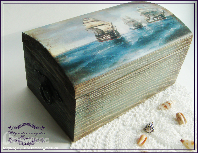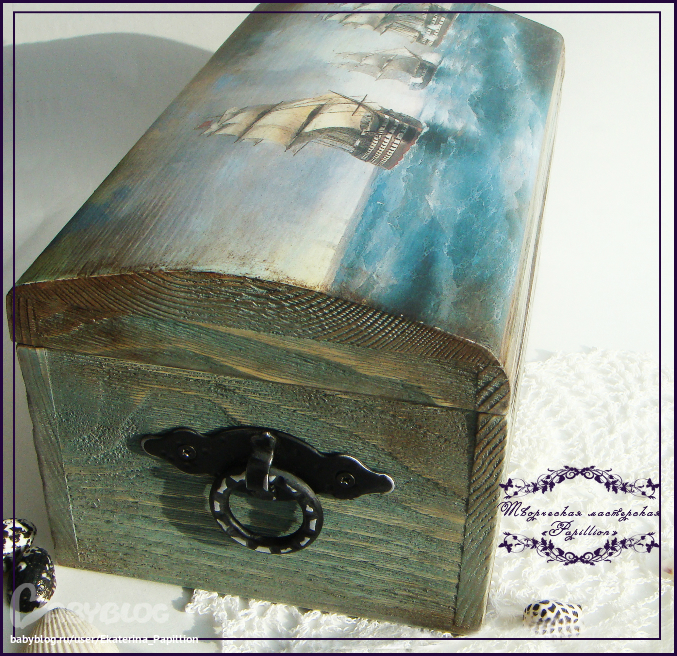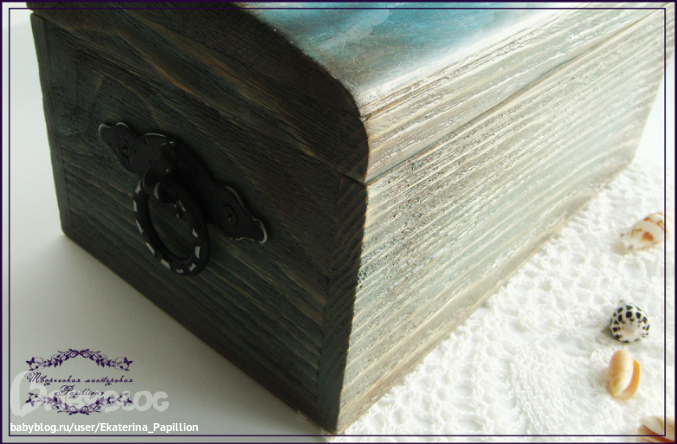 Заказали мне шкатулку с морской темой по мотивом той маленькой "Морской рапсодии", но большую, для бумаг. Взяла заготовку и стукнуло мне в голову, что тут надо браш сделать))) купила щетку, начала делать и поняла, что это я надолго тут застряну. Поэтому взяла дрель с насадкой щеткой. Подрала, поморила акрилом. Но тут меня ждал сюрприз. Цвет вообще не попала... вместо грязно-синего получился цвет морской волны. Поэтому я смешала несколько цветов морилки Плейд, развела чуток водой и получила то, что хотела)) потом попачкала Медиумом Антик Плейд 819. Наклеила истонченную распечатку на фотобумаге. Покрыла все Кивой п/мат. А потом сатиновым лаком Феррарио. Так уже мне нравится поверхность после него)) Фурнитуру по бокам просто пошкурила.