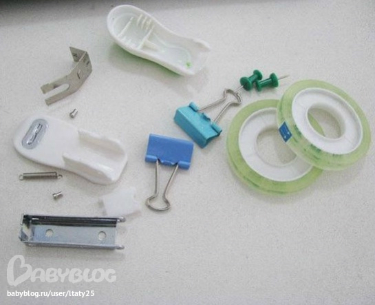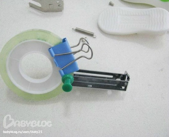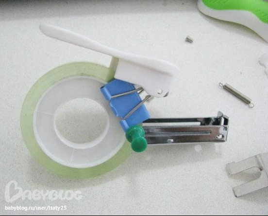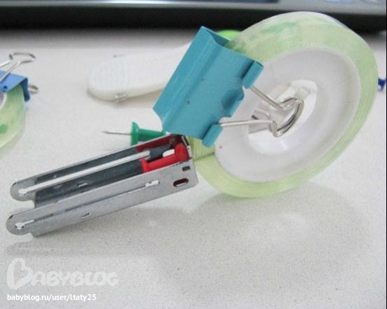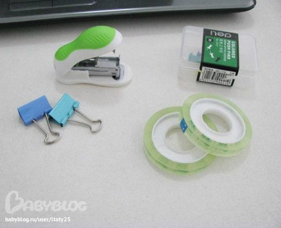 Понадобится степлер, две прищепки для купюр, два маленьких скотча, несколько канцелярских кнопок.