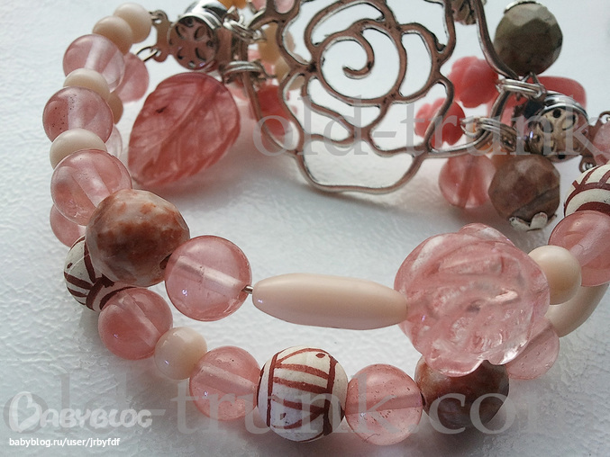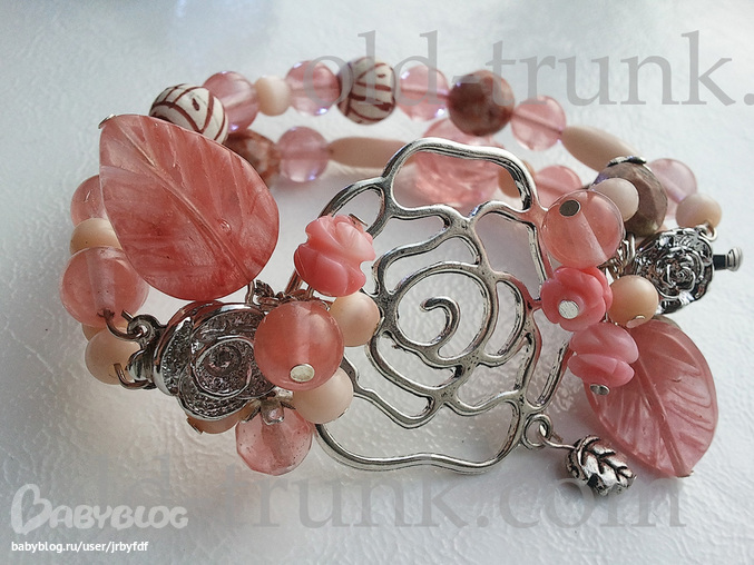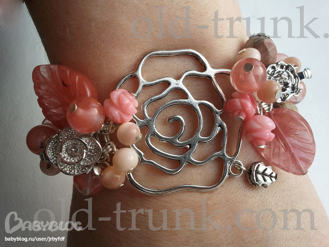 Выполнен из бусин халцедона (шар гладкий и гранёный, резной лист и резная роза), натурального кошачьего глаза, яшмы, резного коралла, керамики и металла. Браслет - краб.