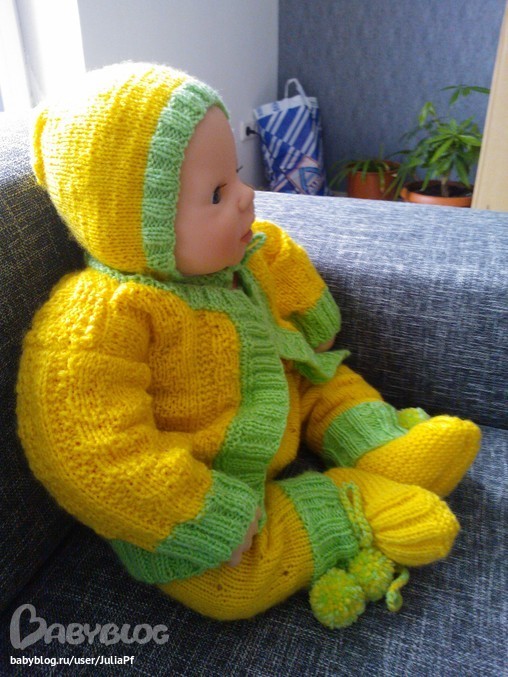 мой первый вязанный костюмчик для новорождённого.На самом деле зелёный цвет намного ярче..)))