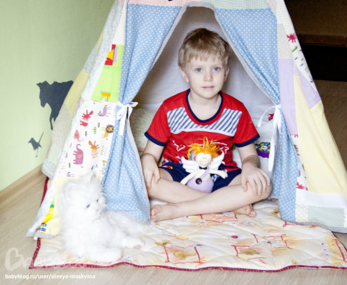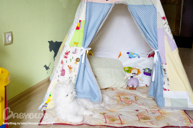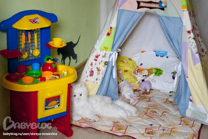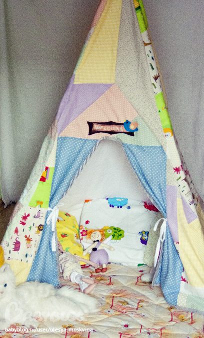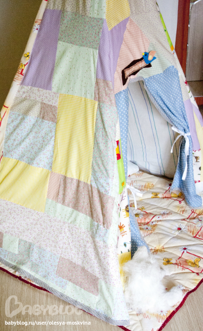 Шитье одежды, выкройки, ремонт одежды, шторы, швейные машины (уже приобретенные)Не знаю то ли это палатка,то ли это вигвам=)),то ли шатер,ну вообщем для деток сшила из остатков ткани,построила палатку с помощью гвоздей и реек и сшила вот такую палатку из кусочков,совмещала я их ,что бы всё подошло,особенно там не выделывалась,т.к. рядом стояли дети постоянно и просили так:"Скорей!Скорей!Долго еще!уже всё?"короче я решила сделать по быстрому и пусть уже играют.На пол теплую мягкую штучку,у нас в квартире жарко,но так уютней в домике,когда такая мягкая шиучка,блин,как ее назвать...что-то совсем туго придумывается всё=))Вообщем,чуток подушек накидали,еще в планах подушки разные..Детки довольные,там все играют,шторки на липучках и можно закрыться,если че.Они часто воюют кто будетна липучки закрывать=)).Потом при сильном бешенстве все наполу с платкой уже лежа=).Сфоткала пока доча спит,а то с ними сложно что-то делать.