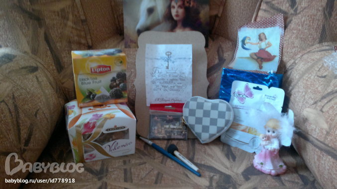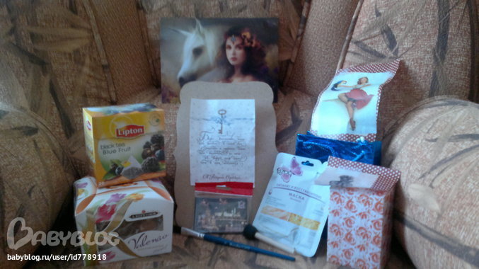 Вот такие замечательные подарочки. Заготовочка для ключей, чтобы декупажить. Замечательные конфетки, вкууусные наверное. Буду мужа ждать с работы, тогда и попробуем. Чаёк мой любимый. Я люблю фруктовый Липтон в пирамидках. Очень он вкусный. Магнитик с городом Москва. Масочка для лица, тоже буду пробовать. Ангелочек с подсветкой, юбочка и крылышки светятся. А открыточку Леночка прислала мне ко Дню Рождения, я её на свой праздник и прочитаю.