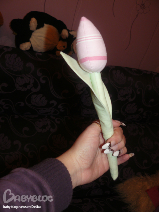 Олечка!!!!!!Я в стебелек вставляла трубочку для коктейля.Цветочек получается с наклоненной головкой,мне кажется,более живой.А шила их из флиса.Посмотрите!А головка тюльпана из трех лепесточков.