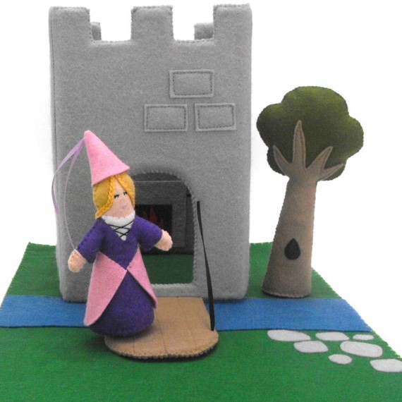 Можно сшить вот такой замок с рыцарем, принцессой, драконом и единорогом. Тоже на дереве и поляне цветочки пришить. Деткам понравится играться.