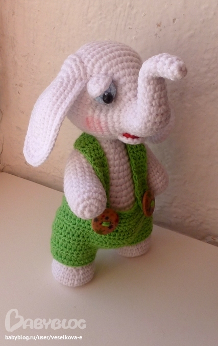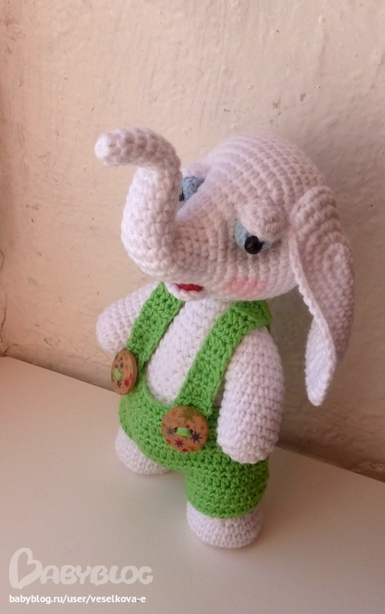 Связаны крючком,утяжелены,хоботы гнутся,одежда снимается,лапки пуговичное крепление.Мальчик 15см,девочка 13см.Ищут родителей)