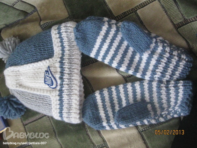 Внутри все из белого флиса)))) а остальное расскажет Настя-она вязала)))) я сказала-свяжи на свое усмотрение....только размеры дала))) ушки там и правда внутренние завязываются...а внешние-для красоты и тепла опять же....на счет пряжи и правда-спросите Настену)))) она вяжет на заказ..