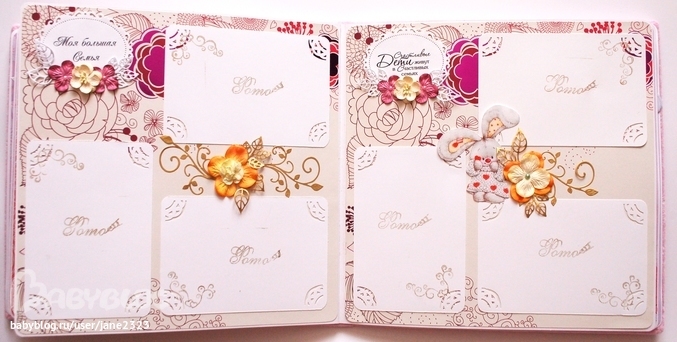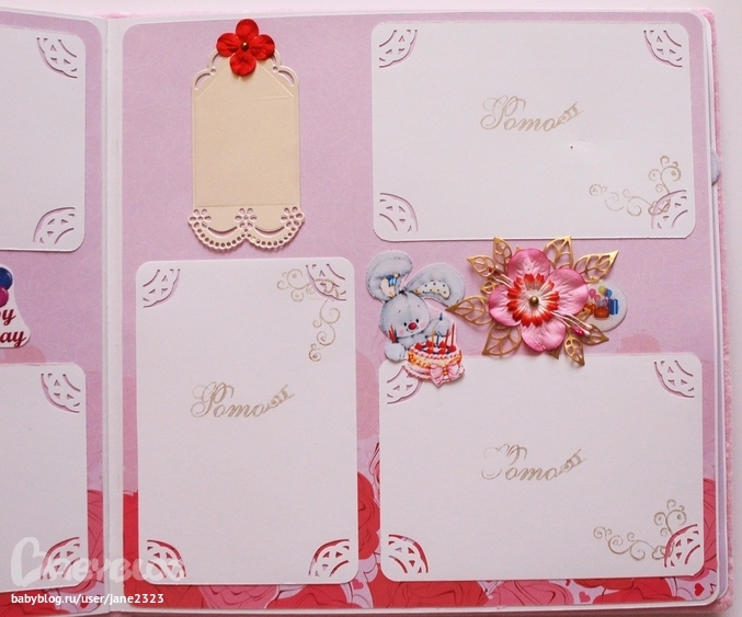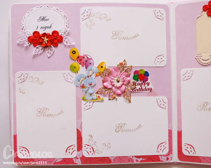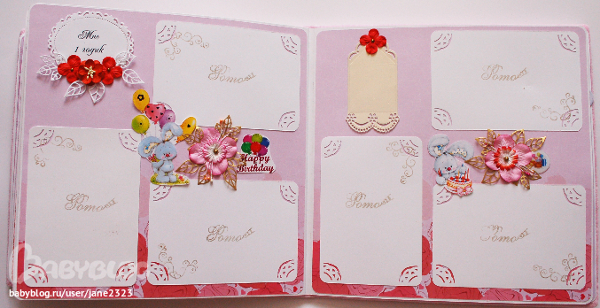 СкрапбукингВот такой получился альбомчик, для маленькой малышки.Заказ был такой: чтобы был розовый, с зайчиками, и много фото.Получился размером 30х30, 10 листов,22 страницы ,62 фото размером 10х15