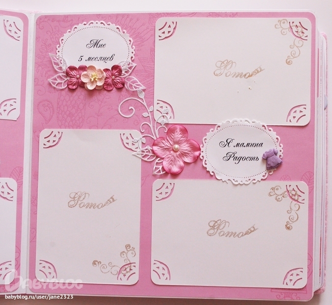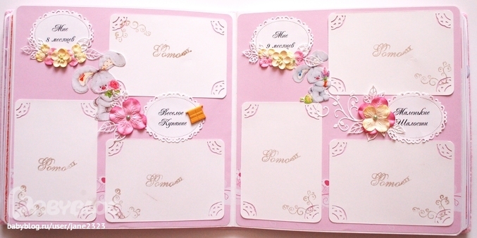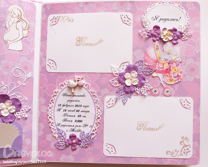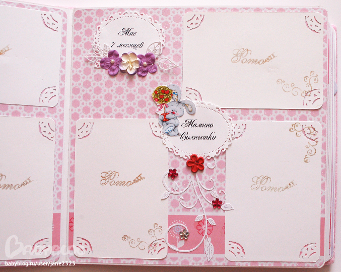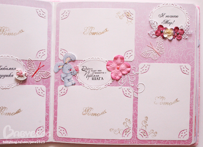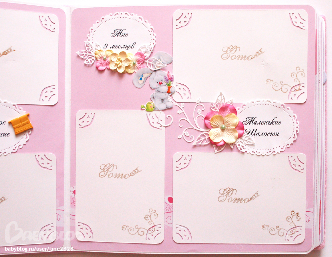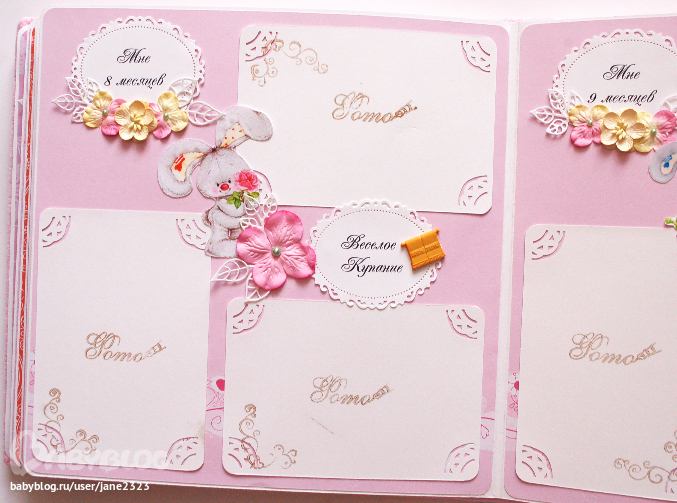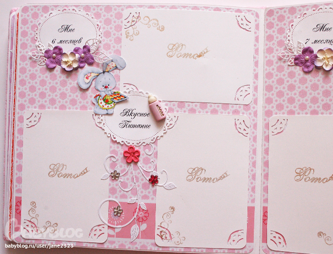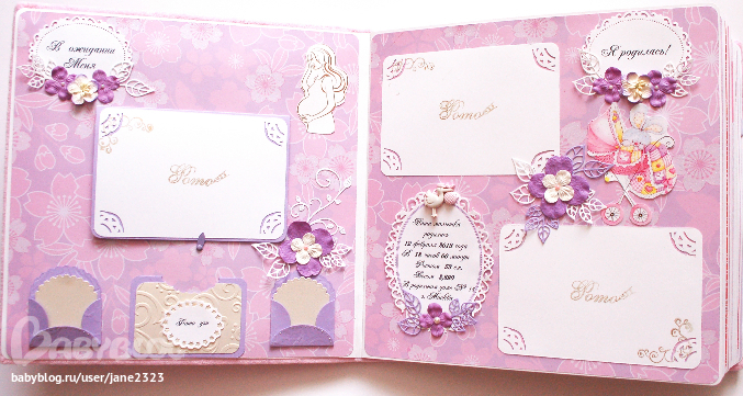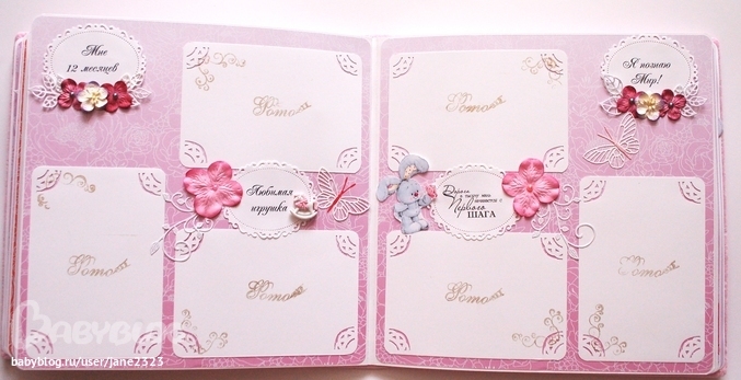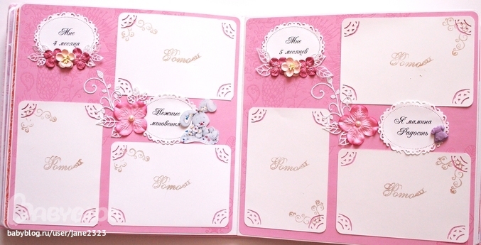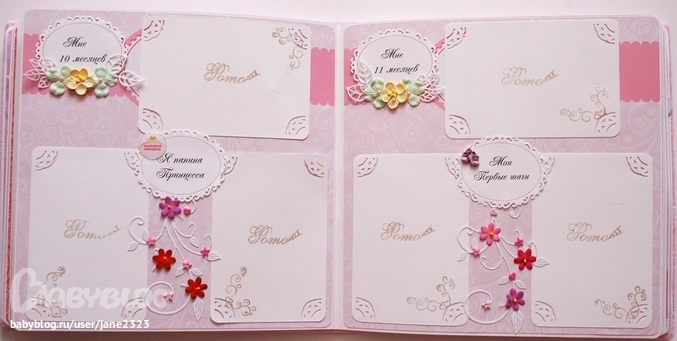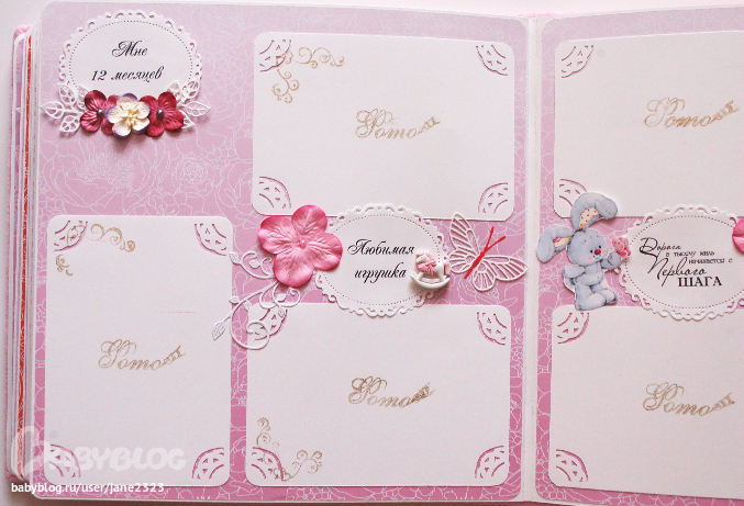 разделы: «В ожидании чуда», «Я родилась!»," Выписка из роддома", Фото по месяцам с 1 по 12 мес," Мне 1 годик","Моя семья",«Мой первый новый год» Места для записи о весе, росте, зубках малыша, места для ладошки и ножки, достижения малыша по месяцам".