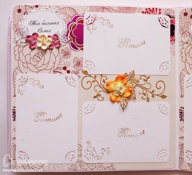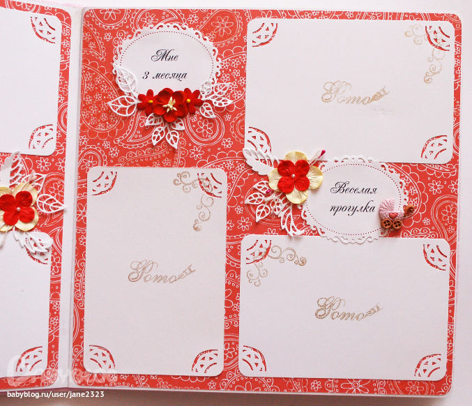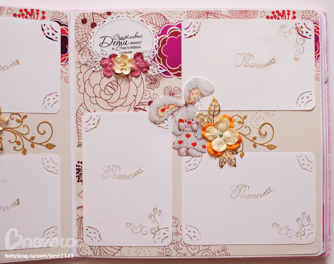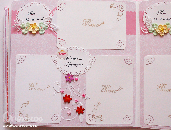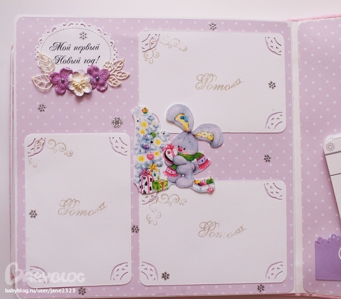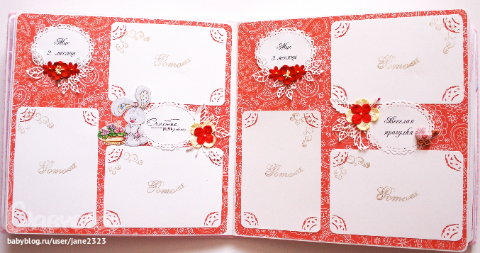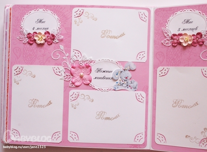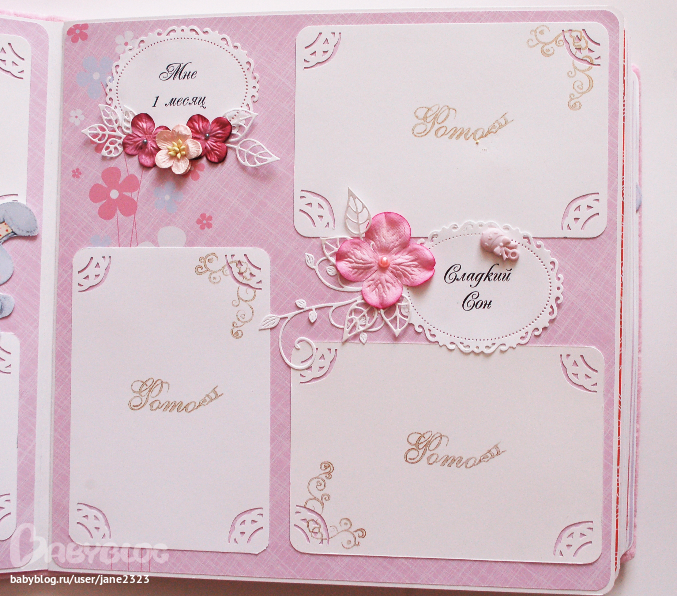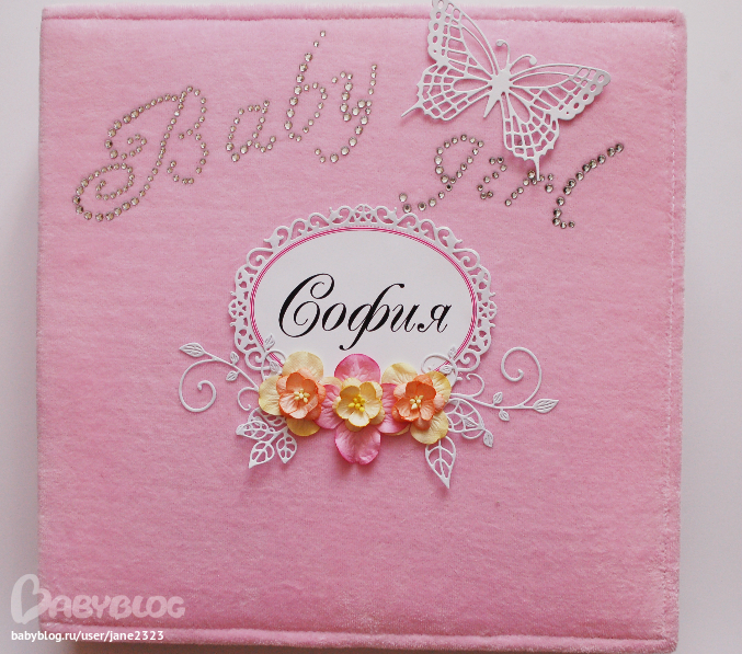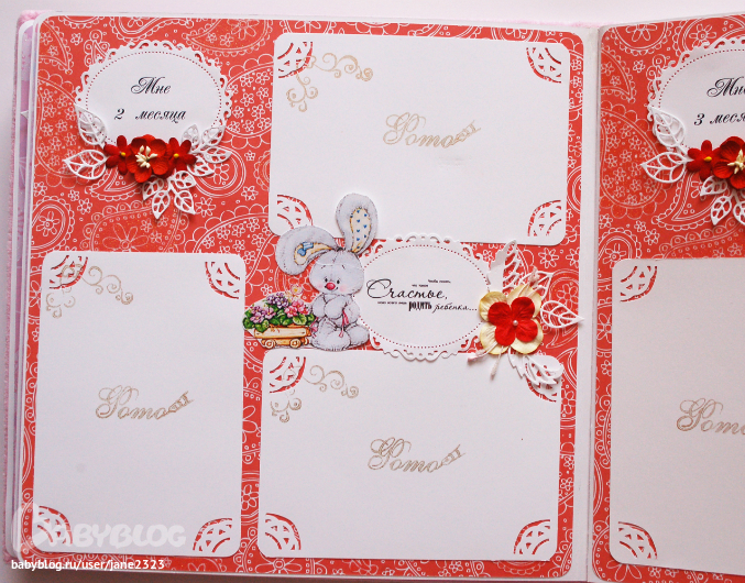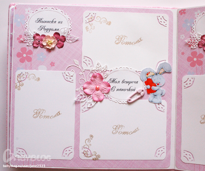разделы: «В ожидании чуда», «Я родилась!»," Выписка из роддома", Фото по месяцам с 1 по 12 мес," Мне 1 годик","Моя семья",«Мой первый новый год» Места для записи о весе, росте, зубках малыша, места для ладошки и ножки, достижения малыша по месяцам".