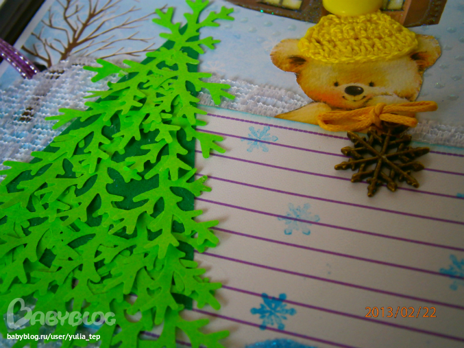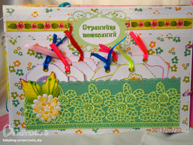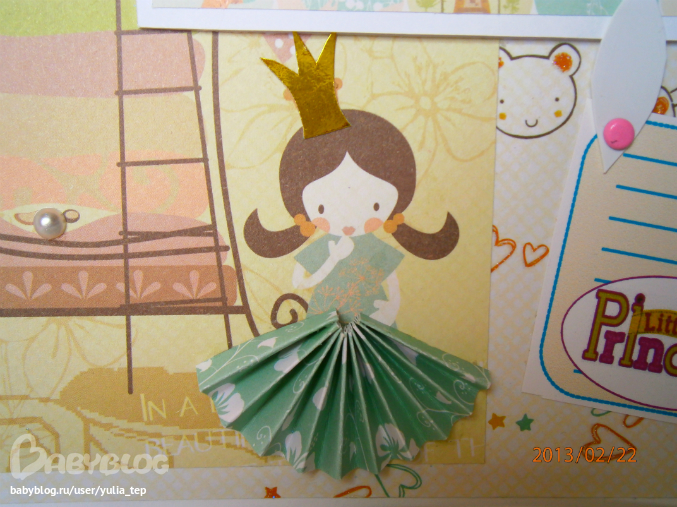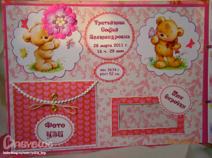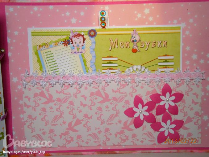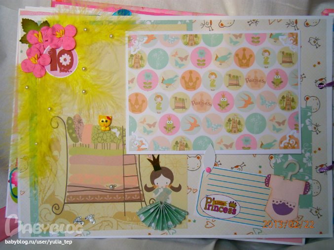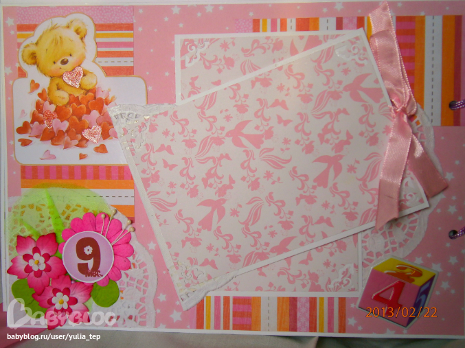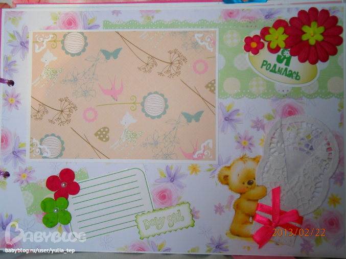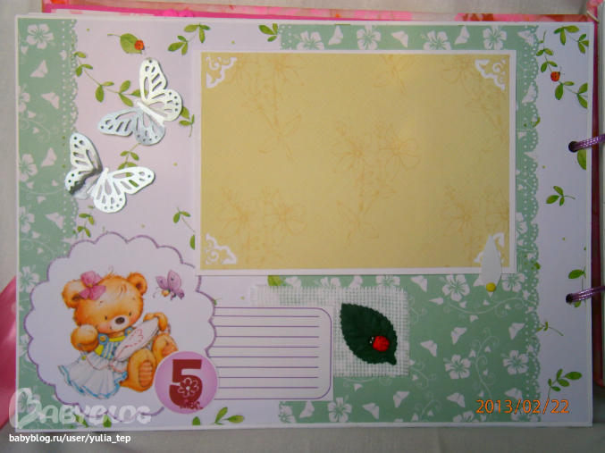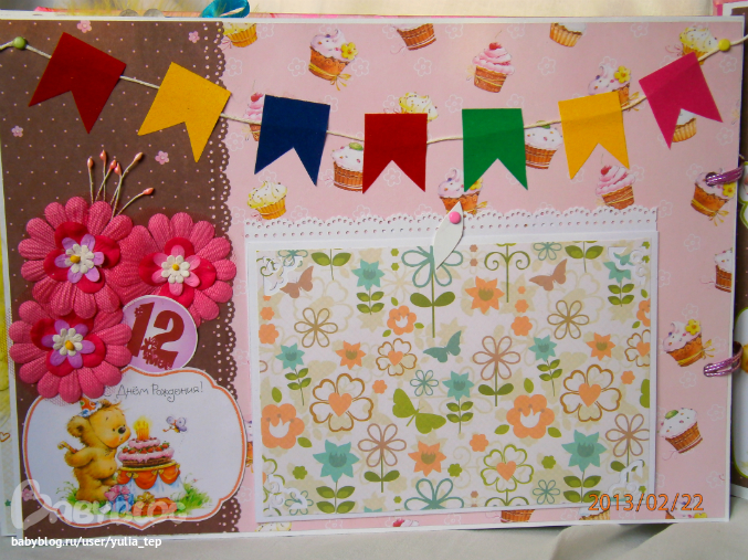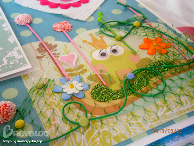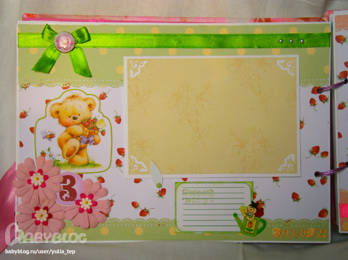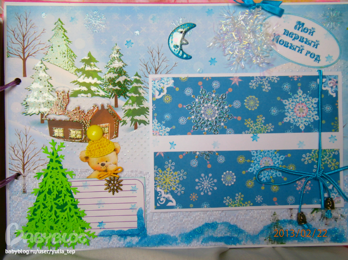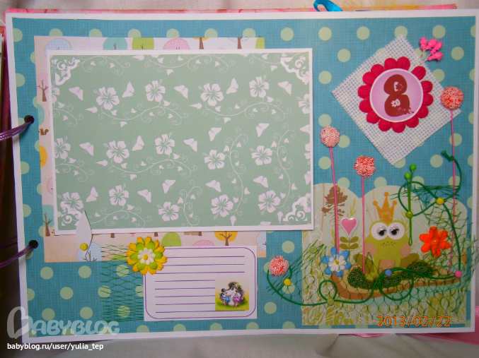 Про цвета. Да, люблю я яркие цвета. Но ведь это детский альбом. Да и как-то с материалом пока выбор не широк. Бумагу нежнее не нашла, а хотелось бы. Ну украшения местами ярковаты, согласна. Ну будем стараться-развиваться)))