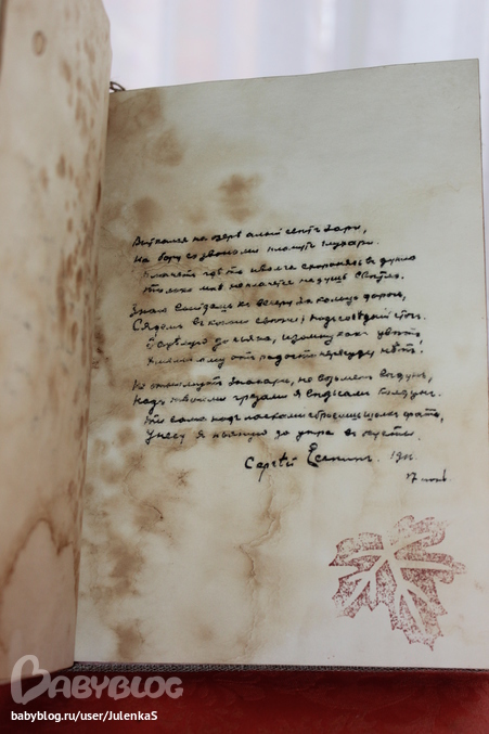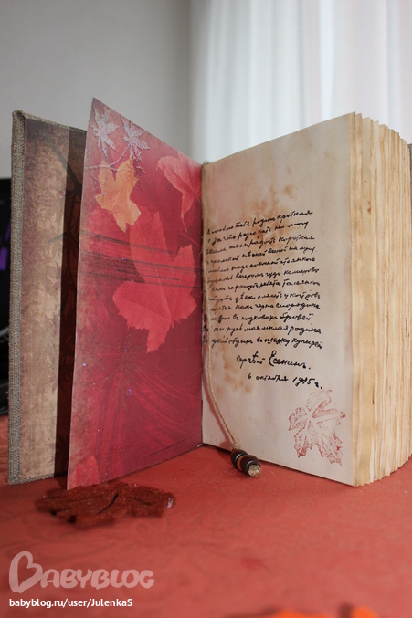 СкрапбукингПервый мой блокнот был сделан на юбилей для свекра в ноябре 2012 года. Ему ооочень нравиться С.Есенин плюс к этому он сам пишет стихи. И достаточно неплохо. Вот поэтому именно таким образом получился этот блокнот. Формата А5, более 100 состаренных в кофе страничек,вручную сплетенный каптал. Обложка из натурального льна украшена деревянной пуговицой, деревянным кленовым листом, кусочком рафии и кусочками натуральной бумаги. Закладка-бечевка с тремя деревянными бусинами. Форзацы блокнота -скрапбумага. В блокноте имеются 4 собственноручно написанных стихотворений С.А. Есенина и одно стиховторение впервые напечатанное в журнале, 4 настоящих листика (кленовые, березовый, дубовый) и одна звезда из натуральной бумаги. Все остальные странички проштампованы кленовым листиком. Вот вроде и все. Фоток много! Буду рада комментариям!!! Пишите!!!