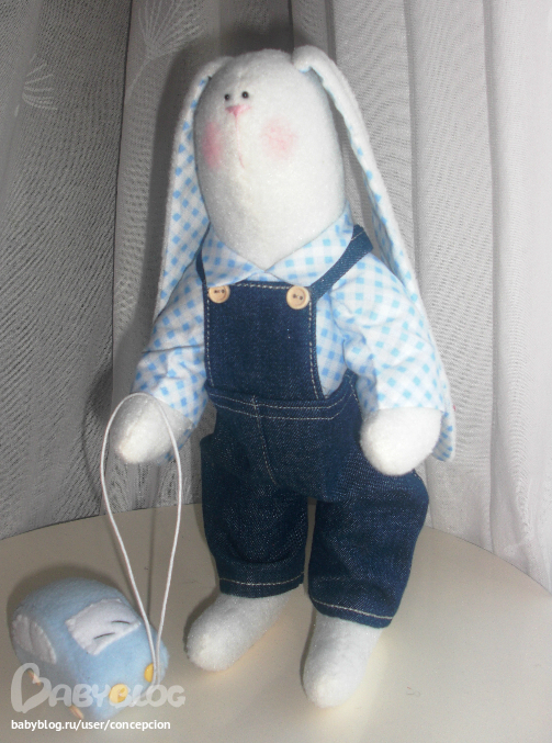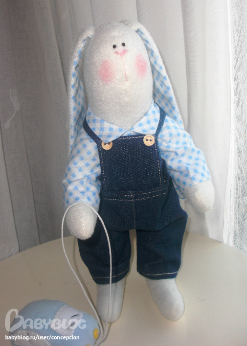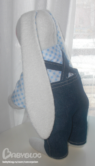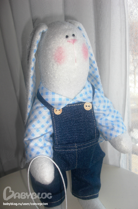 Рост Зайки примерно 30 см, самостоятельно стоит и сидит, одет в хлопковую рубашечку и джинсовый комбинезон (100% хлопок). Зайка ищет новый дом!))