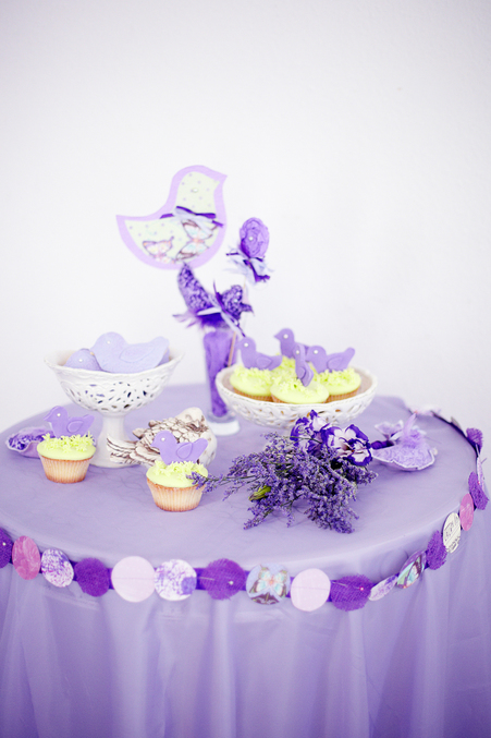 На столе - лавандовая скатерть, украшенная гирляндой из авторской бумаги и ткани.