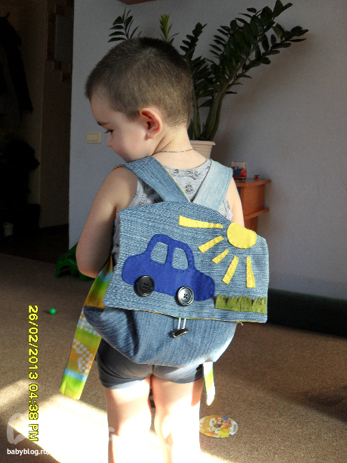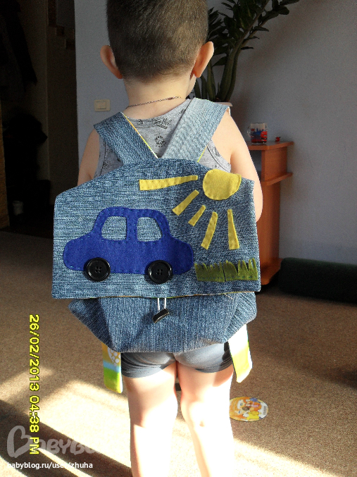 Шитье одежды, выкройки, ремонт одежды, шторы, швейные машины (уже приобретенные)Сидим на больничном и чтоб хоть чем-то заняться сообразили с сынулей вот такой рюкзак.Из старых джинс,фетра,пеленки и кусочка поплина.Что-то я не так сделала,но сынок очень доволен.Положил туда машинку и уже полчаса с ним ходит))))А как вам?