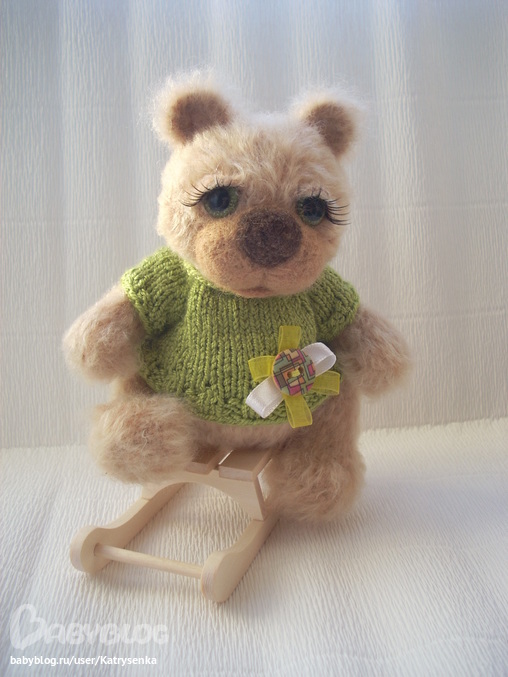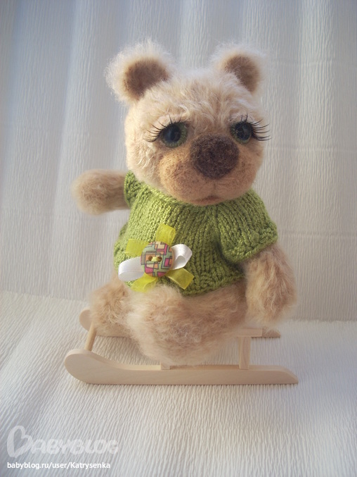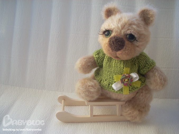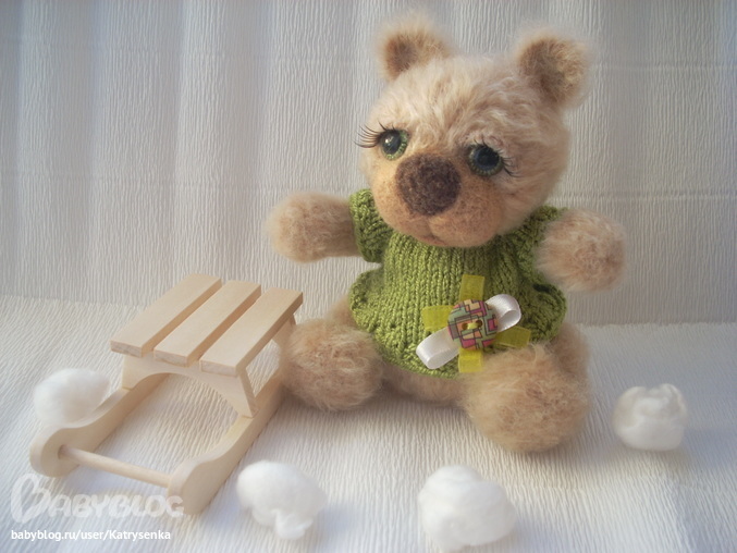 Марина . Росточком мишка всего 15см, связан из фактурной пряжи, плотненько набит синтепоном, шплинтовое крепление - головка, ручки, ножки двигаются, но стоять сам не хочет, только сидит, глазки пластиковые, под цвет глазок попросил себе кофточку. Мишутка хочет насладиться последними зимними деньками, покататься с горки на санках, пока снежок не растаял.