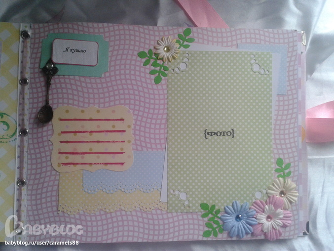 Альбом формата А4, 14 страниц,вмещает 2 фото 9*13, и 28 фото 10*15. Есть кармашек для свидетельства о рождении, конвертик под первые обрезанные локоны, станица под успехи ребенка.